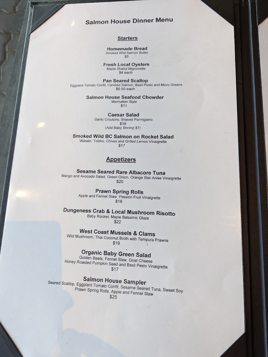 What sets Salmon House apart is its unapologetic commitment to showcasing salmon in all its glory. The homemade bread with smoked wild salmon butter (CA$7.00) serves as a delightful opening act—rich, creamy, and perfectly paired with the artisanal warmth of the bread. The pan-seared scallop nestled in tomato confit and basil pesto (CA$6.50) captures the essence of West Coast flavors, while the seafood chowder (CA$12.00) warms the soul with every spoonful.
